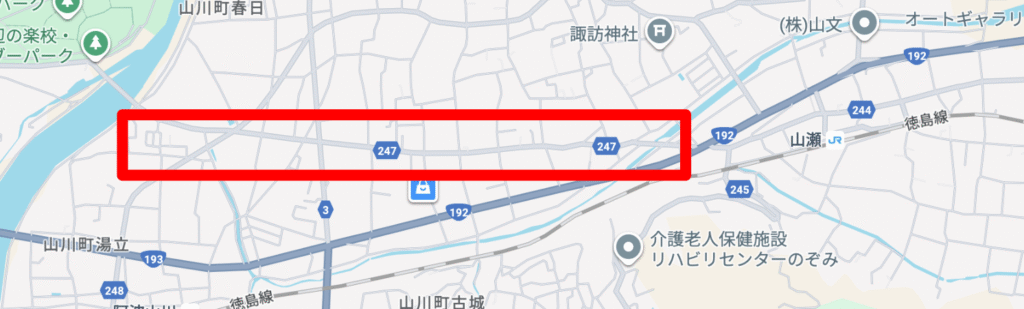 上の画像で言えば、192号線が吉野川の南側を通る自動車の交通量が多い道路です。