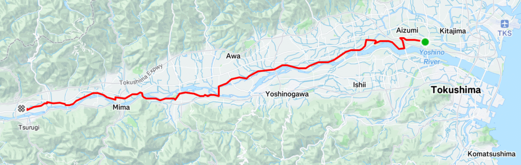 徳島県には吉野川が流れているため、川沿いにサイクリングして県を横切ることができます。今回はあいにくの天気で道中の写真は撮っていませんが、うまく走ればほとんど自動車の通る道を避けてサイクリングすることができそうでした。