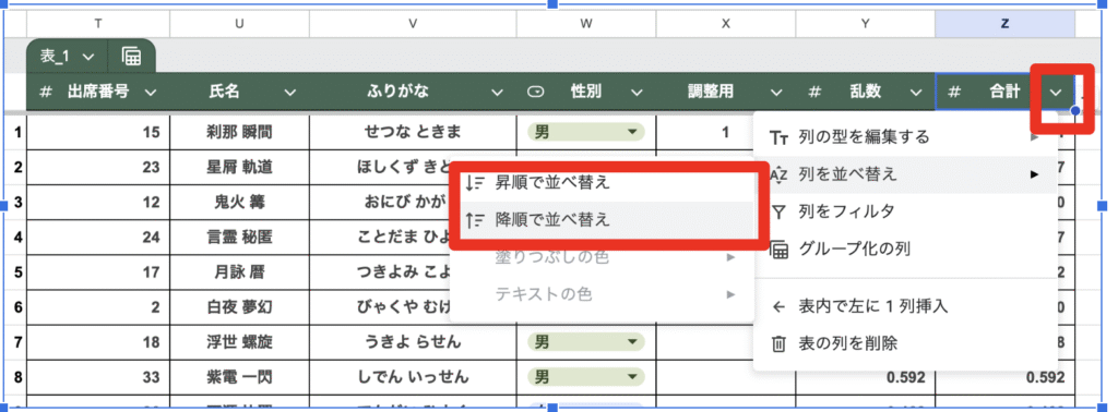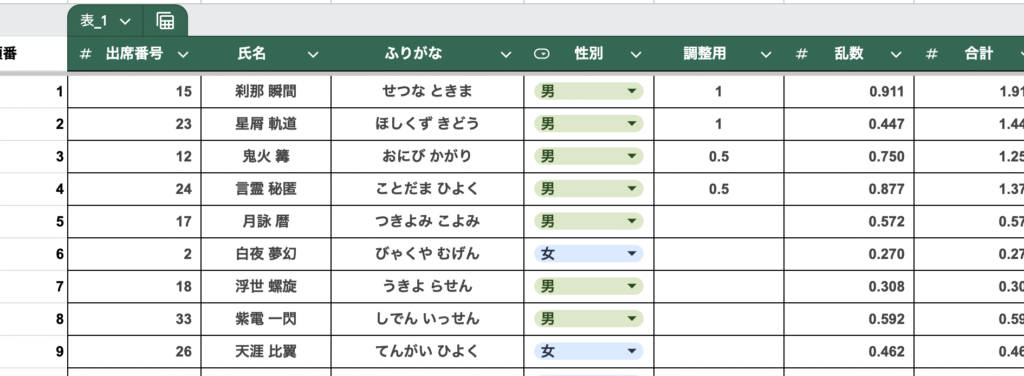 表の【合計】から列を昇順もしくは降順で並べ替えをするとランダムに座席が入れ替わります。