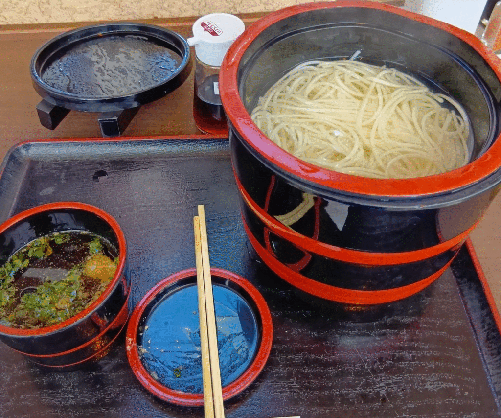 半田そうめんは太くてツルツルで、そうめんでありながらうどんとパスタとそうめんをうまく混ぜた感じの食感が楽しめます。この時は寒くなってきていたため釜揚げでしたが、以前寄った時は確かざる蕎麦の半田そうめん版だったように記憶しています。
