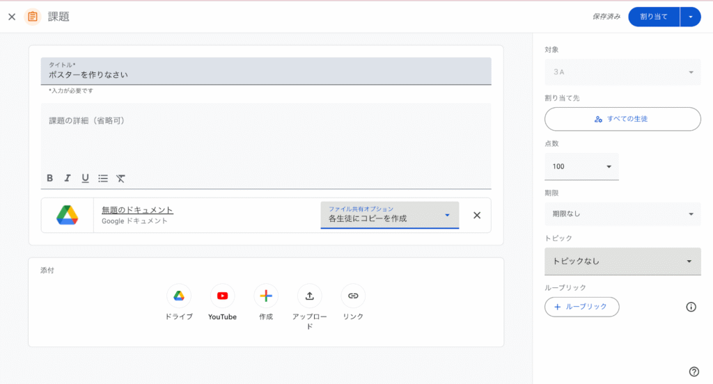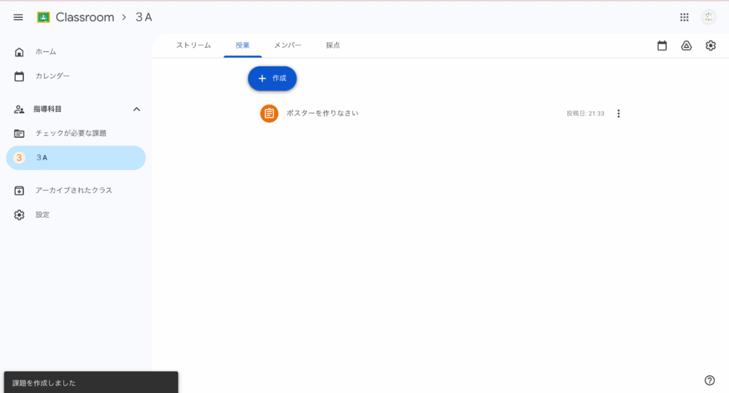 すると、Classroomのフォルダの中に3 Aのフォルダがあって、その下にポスターを作りなさいフォルダーができます。