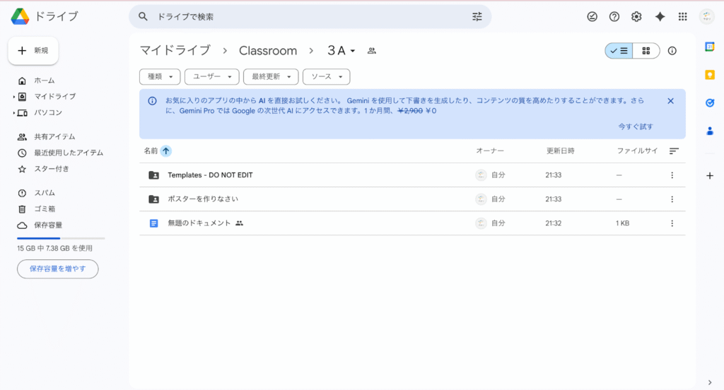 この方法は、意外とClassroomをあんまり使っている人はいなくて、しかもClassroomで課題を出したら、その専用のフォルダが出来ることもあまり知られてないためです。
