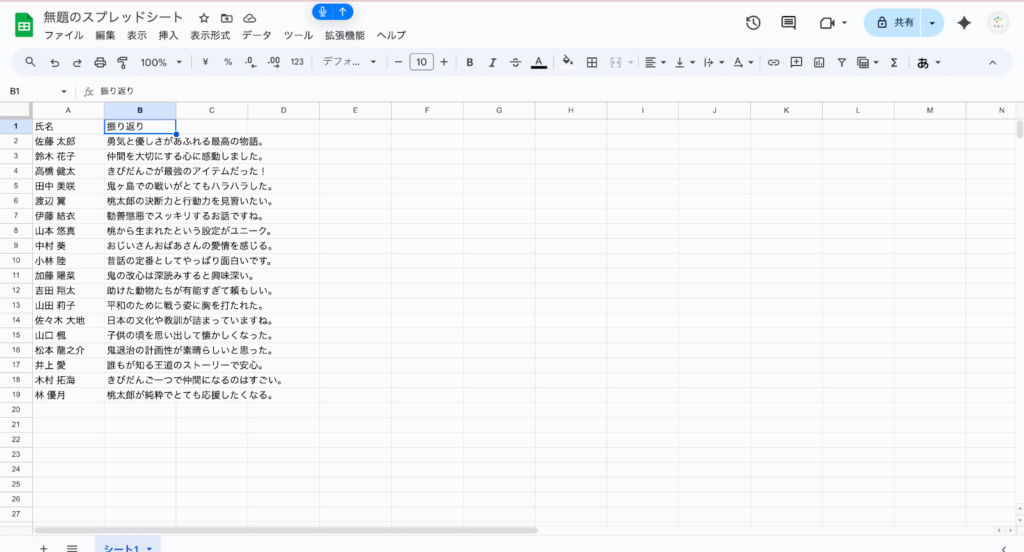 こんな感じでB列に振り返りを書いてもらうといいでしょう。(名前はAIに作成してもらいました)