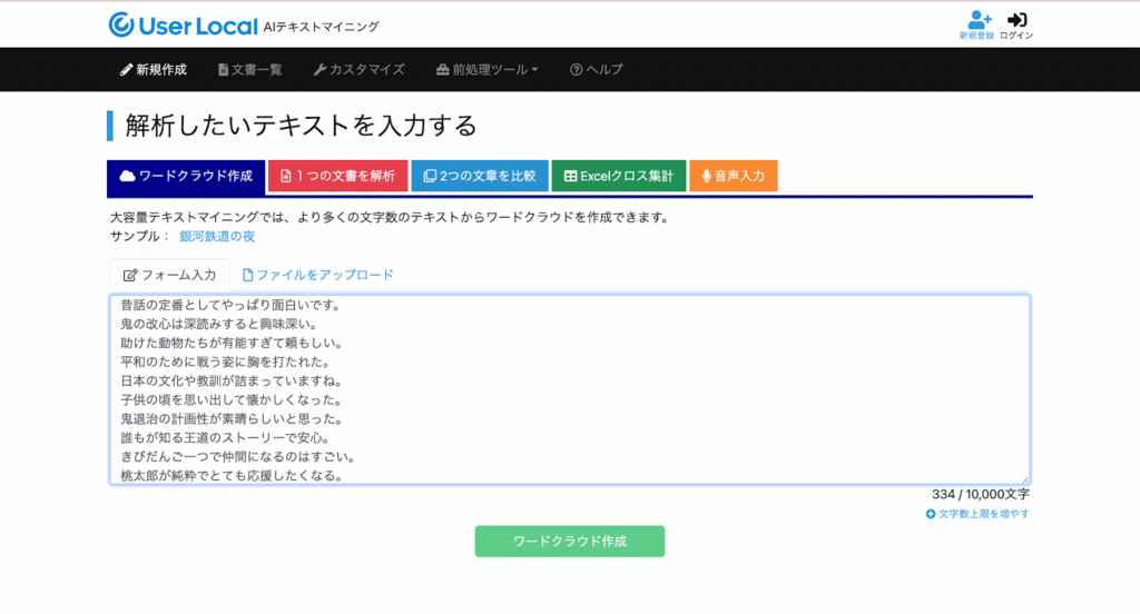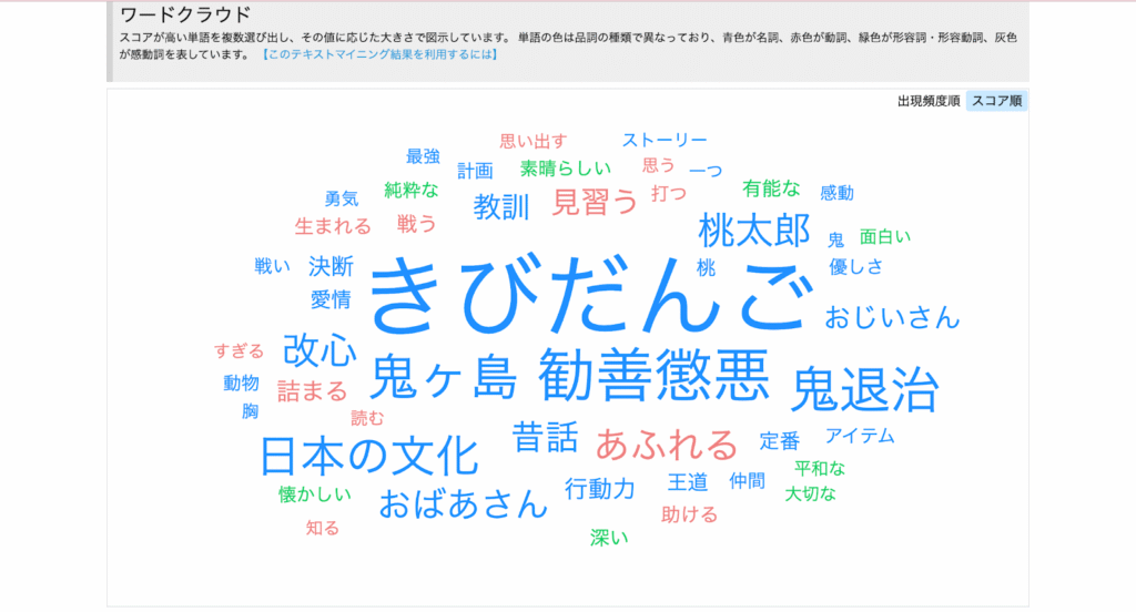 そして、書いてもらった振り返りをそのままコピペして、上記のテキストマイニングに入力をして、みんなの振り返りのテキストマイニングをすることができます。