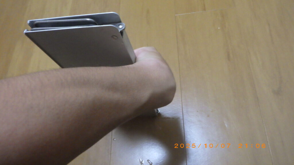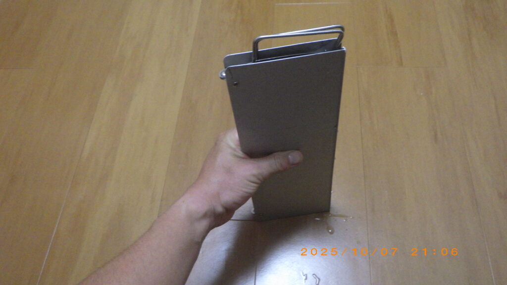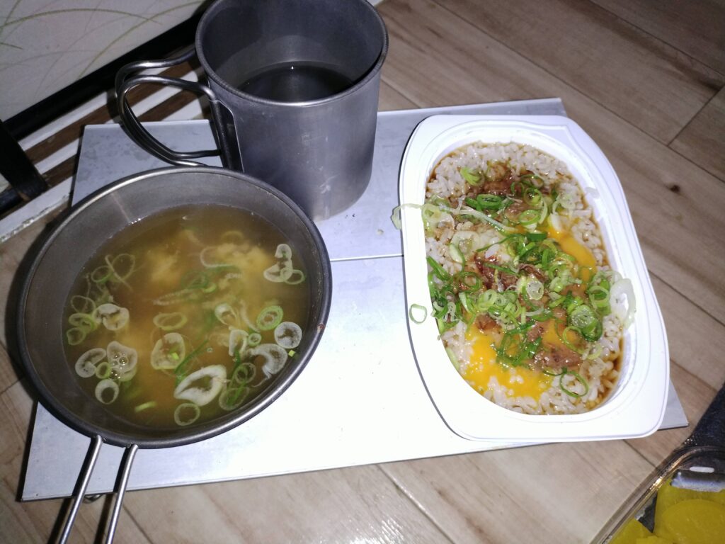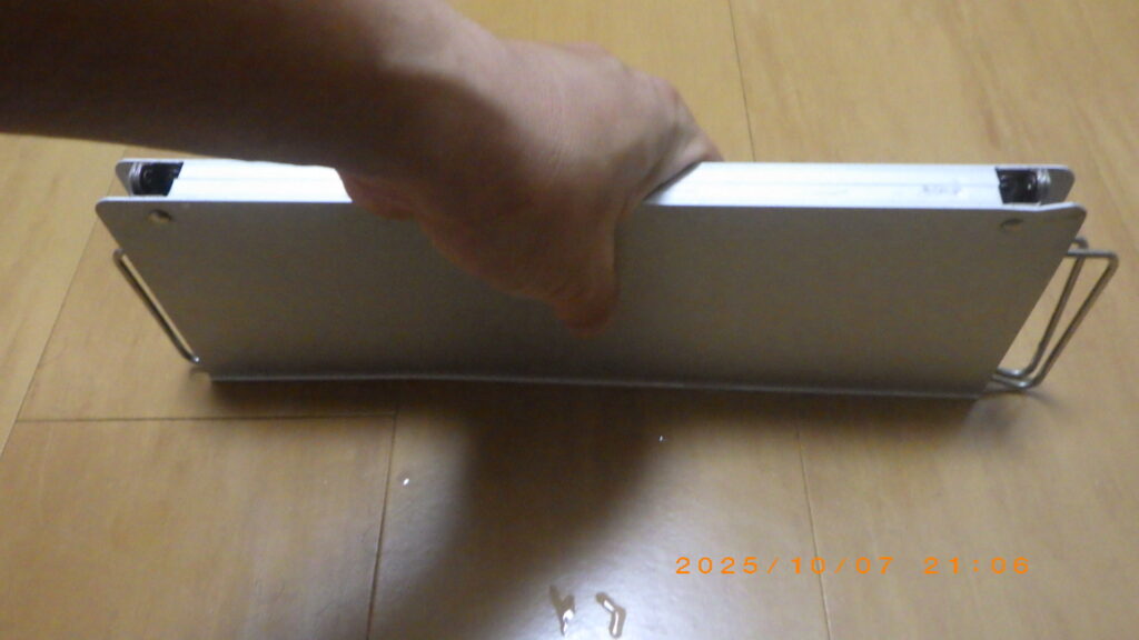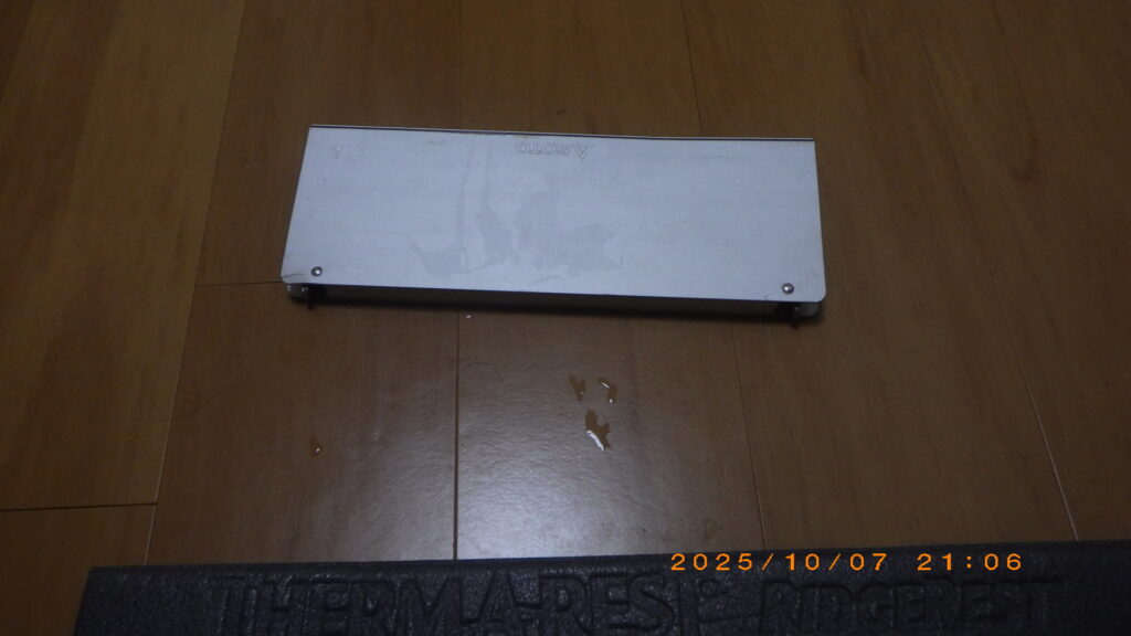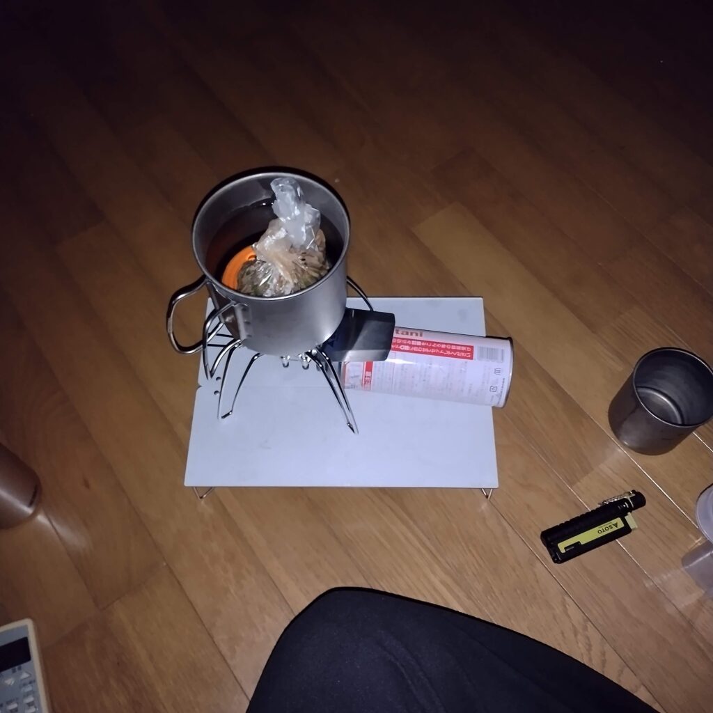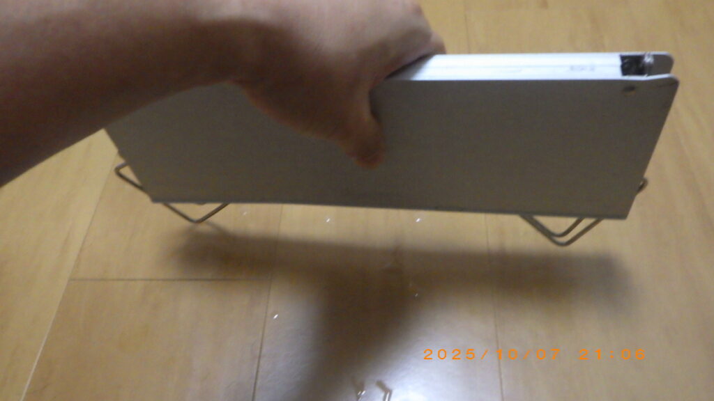 見ての通り、テーブル自体がコンパクト(使用時:幅297×奥行210×高さ78mm)です。一人分の食事なら問題ありませんが、調理器具や複数の飲み物を置くには少し手狭です。あくまで**「ソロ用」**として割り切って使いましょう。