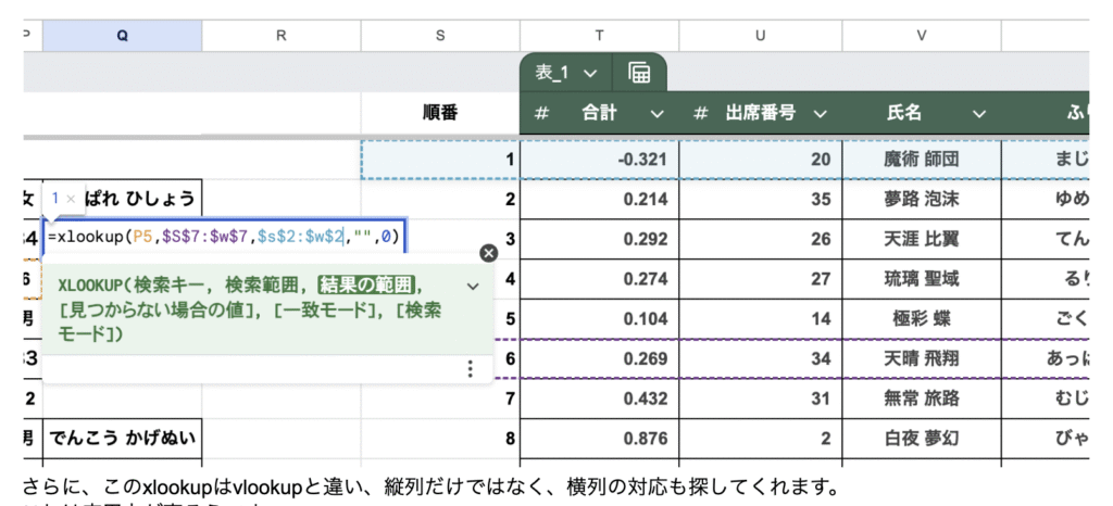 また、vlookup関数の3番目の「左からn番目」という数字よりも「この列から」と指定できるため、これも分かりやすさが向上しています。